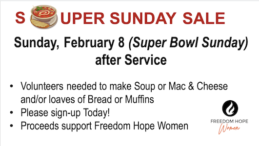 Freedom Hope Women are hosting a soup and bread sale February 8, 2026, which is Super Bowl Sunday. For those of you who enjoy cooking or baking, we need you to donate a pot of your family favorite soup, mac & cheese or a loaf of your yummy home-baked bread or muffins. We are hoping to provide a variety of options. Pint soup containers will be provided.